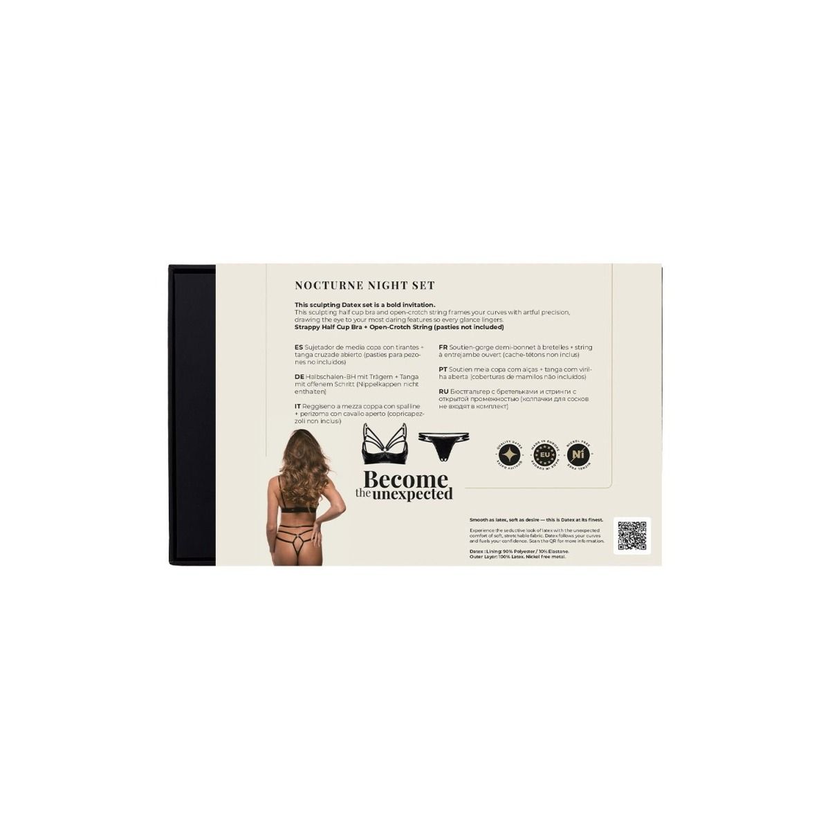 Elevate your lingerie offering with the Nocturne Night Set – a bold and sophisticated ensemble designed for confident expression. Made from premium Datex material, this set merges high-fashion structure with provocative styling, making it a standout piece for high-end boutiques and luxury intimate wear collections.