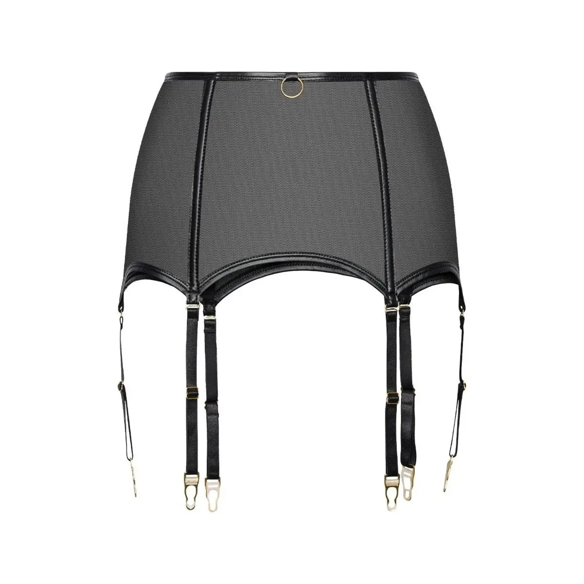 The Shimmering Suspender Belt combines sensual design with golden accents to sculpt and flatter the waist. Crafted from soft black mesh, it elongates the silhouette while gold-tone suspender clips and a central ring add a bold, refined touch.