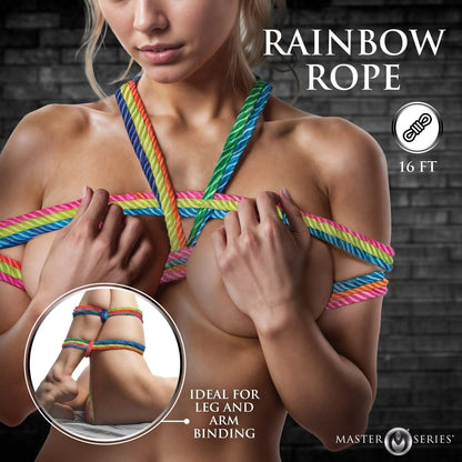 Brighten up your BDSM play with this neon rainbow-colored bondage rope! Perfect for kinbaku or shibari rope tying, this versatile rope is ideal for partner play or solo practice.
