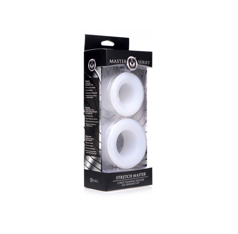 Train that hole! These ass grommets will keep it spread wide open leaving the insides exposed for penetration liquid play or just an innocent peek inside! Two are included so that you can start with the smaller grommet and work your way to the larger. The firm yet flexible material keeps the opening of the hole pried open for an enjoyable stretching sensation. This unique training set is ideal for advanced anal enthusiasts. Made of premium silicone they are non-porous and phthalate-free. Clean after use with mild soap or toy-cleaner and avoid use with silicone lubricants.