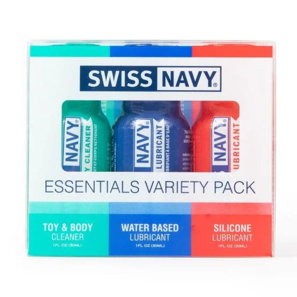 Essentials Variety Pack includes a 1 oz. bottle of each Premium Silicone Lubricant, Premium Water Based Lubricant, Premium Toy and Body Cleaner.
